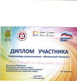Спасибо всем ребятам и родителям, кто поддержал детей и поучаствовал вместе с ними в веселых соревнованиях Спартакиады дошкольников «Маленький чемпион»! Это первые городские массовые старты дошкольников, которые принесли много позитива нашим участникам. Спорт – это лучший жизненный тренинг. Приобщая ребенка к физкультуре, папы и мамы заботятся о его здоровье, учат побеждать в любом деле и делают семью дружнее! Пожелаем нашим участникам здоровья и дальнейших Побед!