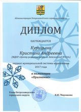 Наша коллега Курицына Кристина Андреевна заместитель заведующего по воспитательной и методической работе стала Лауреатом муниципальной системы образования в номинации «Признание». Торжественная церемония награждения лауреатов 2017 года прошла 26 декабря во Дворце творчества детей и юношества г. Петрозаводска. Почетным званием «Лауреат года 2017» за профессионализм педагогов и талант их юных воспитанников удостаиваются работники науки, культуры, образования за личный вклад в научное, культурное развитие Карелии. Глава Петрозаводска Ирина Мирошник поздравила лауреатов и вручила каждому диплом Администрации города. Мы очень рады, что Кристина Андреевна вошла в число лауреатов. Это – заслуженная награда.