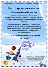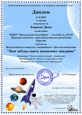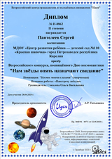 В апреле наши воспитанники приняли участие во Всероссийском творческом конкурсе «Нам звёзды опять назначают свидание». Конкурс проводился по номинациям: «Космос моими глазами» - рисунки, аппликации, поделки, плакаты в различной технике исполнения; «Мой летательный аппарат» - макеты космической ракеты; «Человек покорил даже звёздные дали!» - видеоработы (аудиофайлы) на которых ребёнок (группа детей) рассказывает стихотворение (можно любого автора), прозу, поёт песню или участвует в сценке по теме конкурса; «Театр моды» - фотографии костюмов, коллекций, отражающих идею, тему конкурса; Свободная тема - работы по теме конкурса, не вошедшие в перечень предыдущих номинаций.